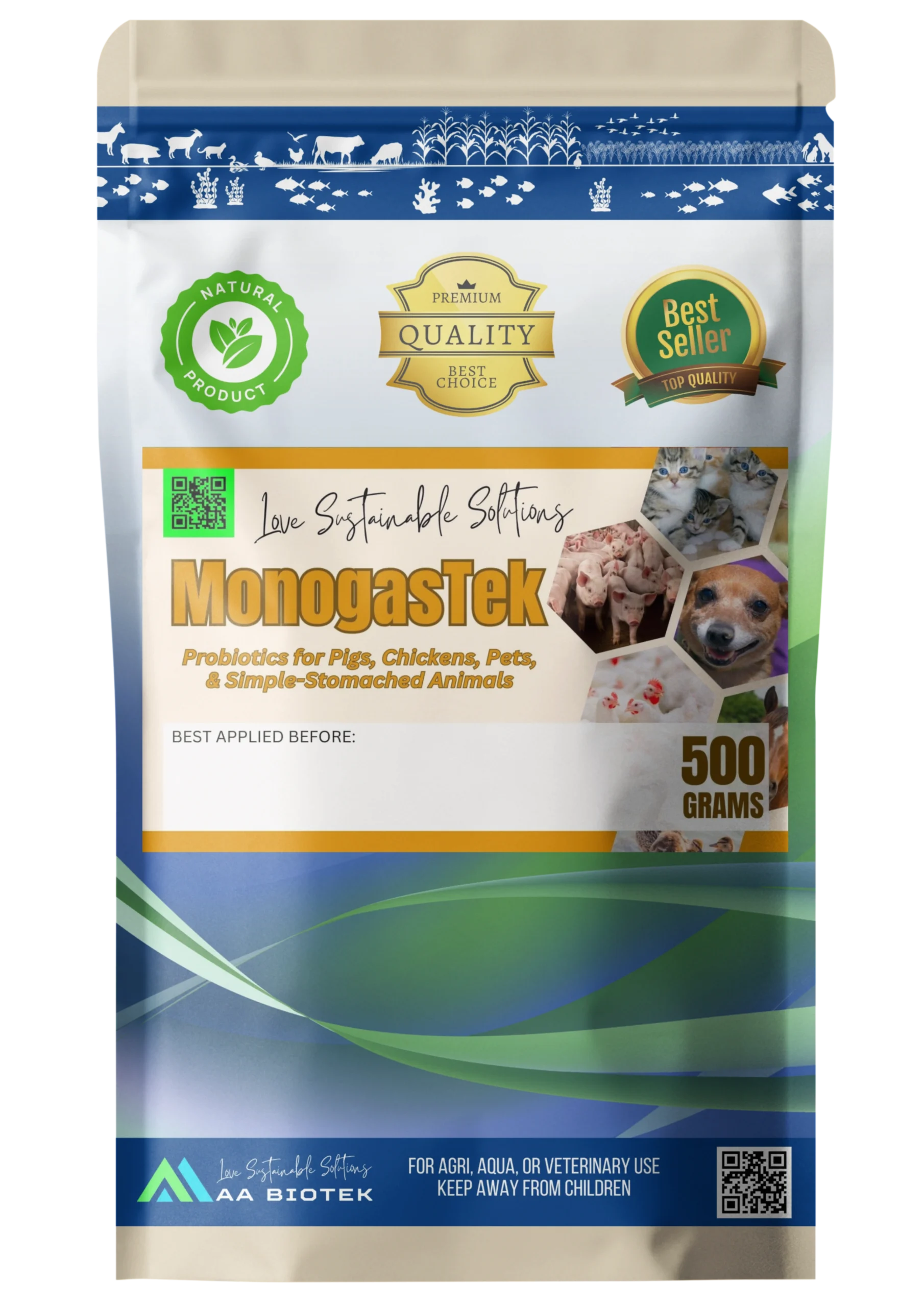MonogasTek is a powerful probiotic probiotic for simple-stomached animals designed for pigs, chickens, pets, and other simple-stomached animals. It combines Bacillus sp., Saccharomyces spp., and Lactobacillus sp. to improve gut health, enhance digestion, and strengthen the immune system. MonogasTek supports overall well-being and ensures better health for your animals.